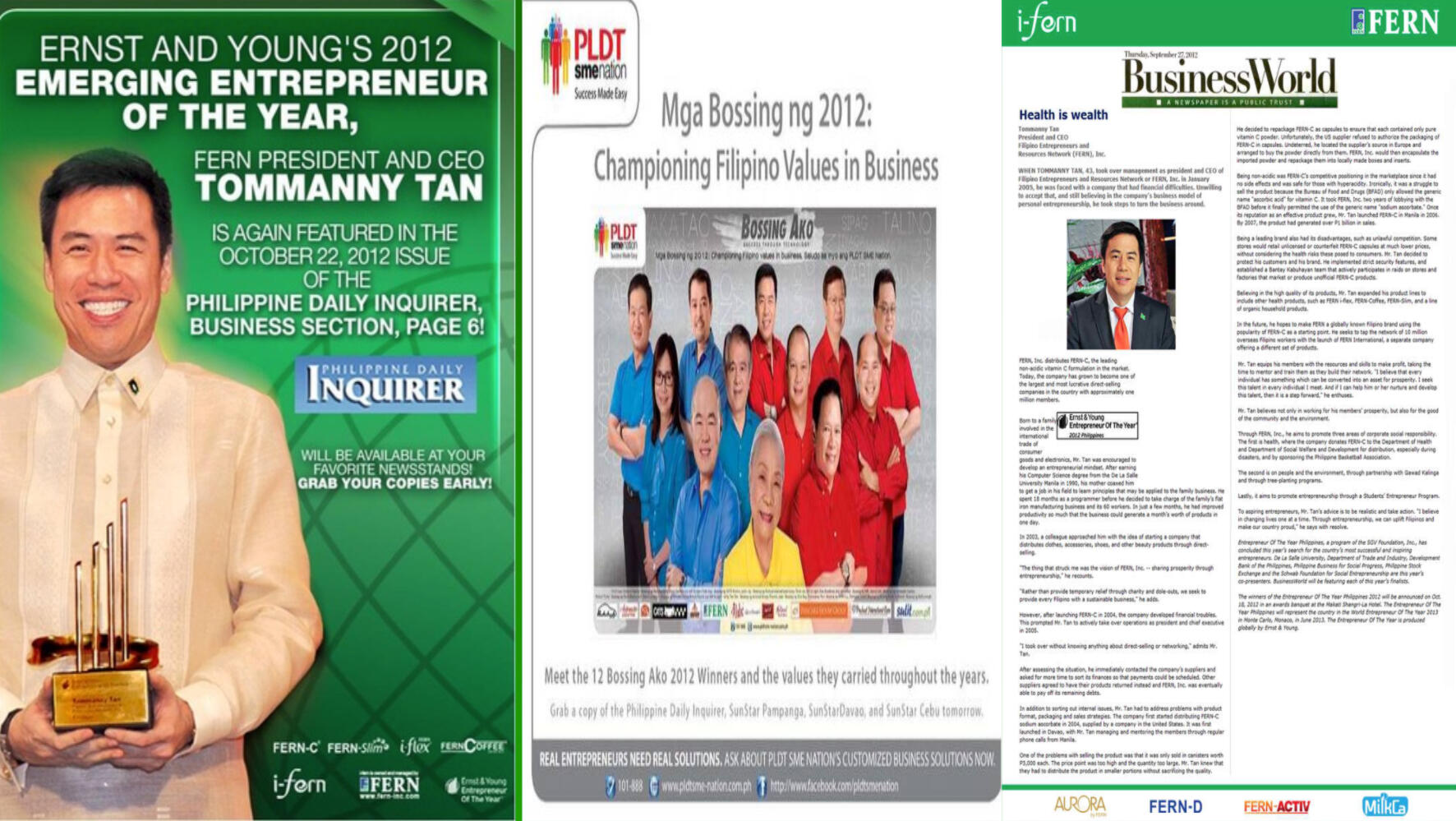 Inspiring, articulate and dapper MVP Bossing Awardee for 2011, Tommanny Tan is an accomplished businessman, involved in the import of consumer goods from the U.S., Taiwan, China and Japan. For more than two decades now, he has been into auto trading, packaging, repacking and food retail outlet businesses. He is a graduate of BS Computer Science at De La Salle University-Manila and has a Masters degree in Entrepreneurship from the Asian Institute of Management. But what has gotten him the most attention and recognition is being the top man of Fern Inc., a direct selling and network marketing company founded in 2003. It offers the average Filipino a potentially rewarding business through the use and distribution of Fern Inc. products. The company has grown from only six employees and a handful of members to over 150 employees and a million-strong network base.